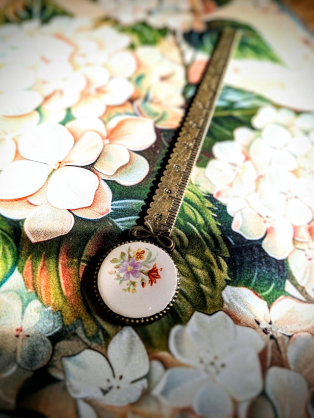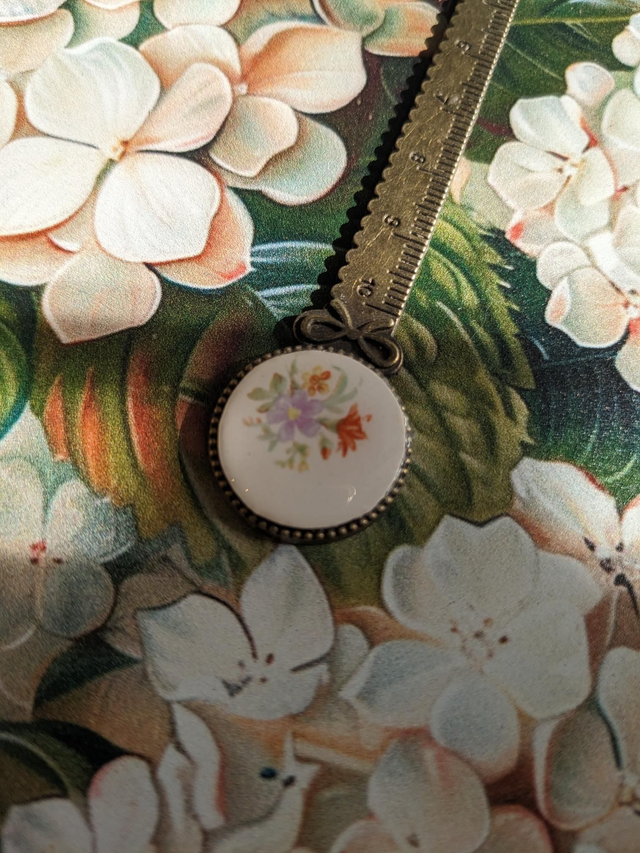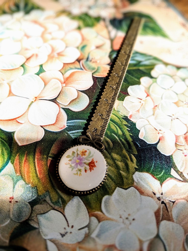 Le marque-page Lisette est façonné à partir d’un éclat de porcelaine ancienne, soigneusement découpé et poli, pour révéler un délicat motif floral .